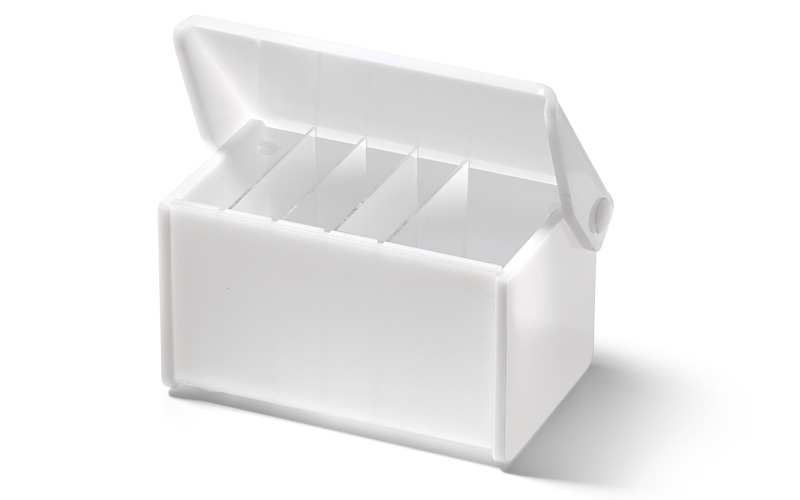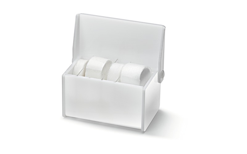 Коробка из высококачественного акрила для гигиеничного хранения кополина или других рулонных перевязочных материалов, например, самофиксирующихся бинтов. Съемные перегородки внутри бокса позволяют изменять ширину отсеков. Размеры Д/Ш/В: 9/5,5/5,4 см.