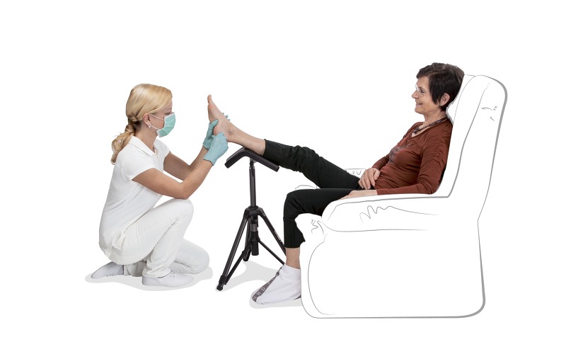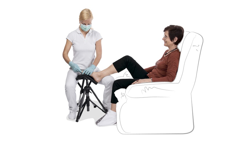 Решением этой проблемы является многофункциональная подставка для ног. Ее инновационная форма позволяет мастеру устанавливать оптимальный рабочий угол для обработки пальцев ноги, не причиняя при этом ни малейшего дискомфорта клиенту. Даже труднодоступная пяточная область при соответствующей мобильности клиента обрабатывается легко и быстро. Устойчивый штатив гарантирует хороший контакт с полом, а рычаг быстрой регулировки позволяет удобно изменять положение ножной опоры. После завершения процедуры подставка легко собирается и упаковывается в специальный чехол.