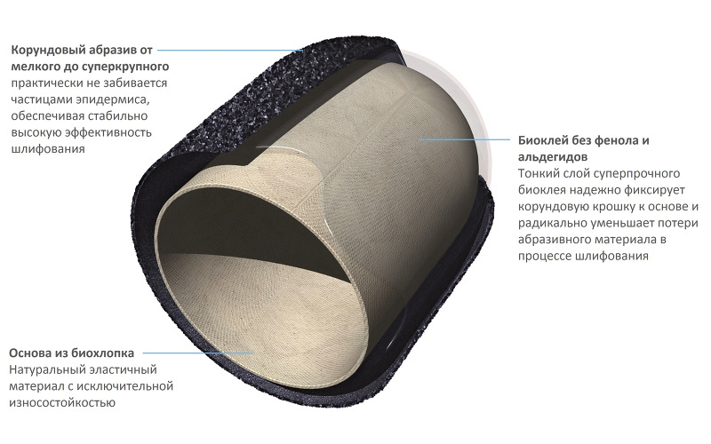 При производстве новых колпачков на основу из натурального хлопка наносится очень тонкий слой сверхпрочного биоклея. В результате больше граней абразивной частицы остаются свободными для контакта с эпидермисом, а поверхность колпачка меньше забивается пылью.
