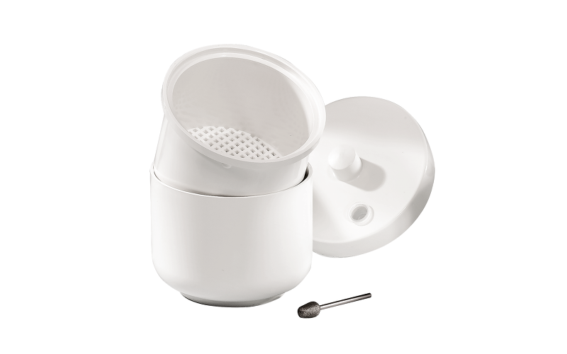 Емкость для дезинфекции фрез с крышкой и ситечком в виде вынимаемого стакана. Объем - 150 мл.