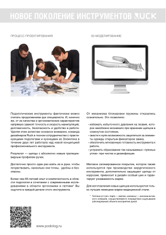 Подологические инструменты фактически можно считать продолжением рук специалиста. И, конечно же, от их качества и эргономических характеристик напрямую зависят точность и скорость манипуляций, долговечность, безопасность и удобство в работе. Уделяя этим аспектам основное внимание, команда дизайнеров Ruck в тесном сотрудничестве с практи- кующими подологами и кузнецами из Золингена в течение двух лет работала над новой концепцией профессионального инструмента.