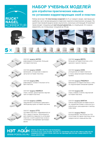 Набор включает 12 пластиковых моделей (по 5 шт каждого вида), имитирующих наиболее часто встречающиеся в практике подолога клинические ситуации. На одной пластиковой модели можно выполнить несколько аппликаций. В комплект также входит специальный настольный держатель со струбциной. Его можно закреплять на столешнице толщиной до 45 мм.