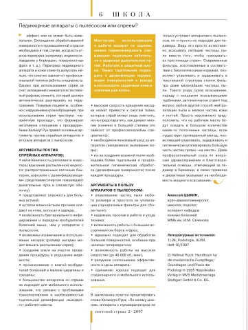 только уступают аппаратам с пылесо- сом, но и просто не подходят для пе- дикюра. Ведь это просто естествен- но всасывать летящие частицы пы- ли вместо того, чтобы «связывать» их при помощи спрея». Современные фильтры, изготовленные в соответс- твии с биологическими нормами, поз- воляют улавливать и задерживать в текстильной структуре стенок филь- тра даже мельчайшие частицы пы- ли. Такого рода сухое всасывание, наряду с мощными всасывающими турбинами, автоматически ставит под вопрос любой другой способ нейтра- лизации пыли и мелких частиц кожи и ногтей. Просто невозможно пред- положить, что на рабочем месте бу- дут оседать в большом количестве какие-то патогенные частицы, если существует проверенный метод, поз- воляющий улавливать, задерживать и гигиенически утилизировать большую часть частиц прямо «на месте». Даже профессиональный союз по вопро- сам здравоохранения и благотвори- тельной помощи, отвечающий за пе- дикюр в Германии, в своих правилах и директивах указывает на необходи- мость мощного всасывания».