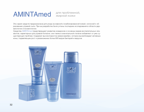 Средства AMINTAmed предотвращают развитие комедонов и основных видов воспалительных эле- ментов, характерных для угревой болезни, они также в значительной степени избавляют от уже су- ществующих проблем. Содержат высокопористое микросеребро, которое высвобождает активные ионы, подавляющие рост и размножение более 600 видов бактерий и вирусов.